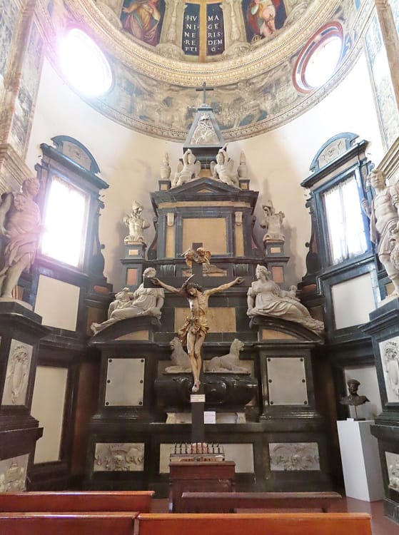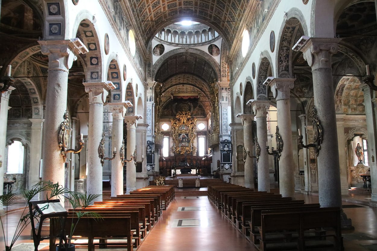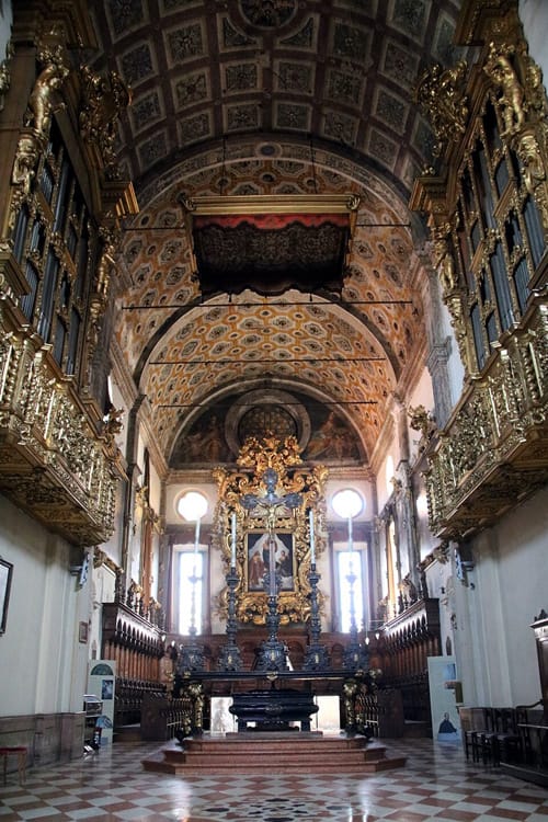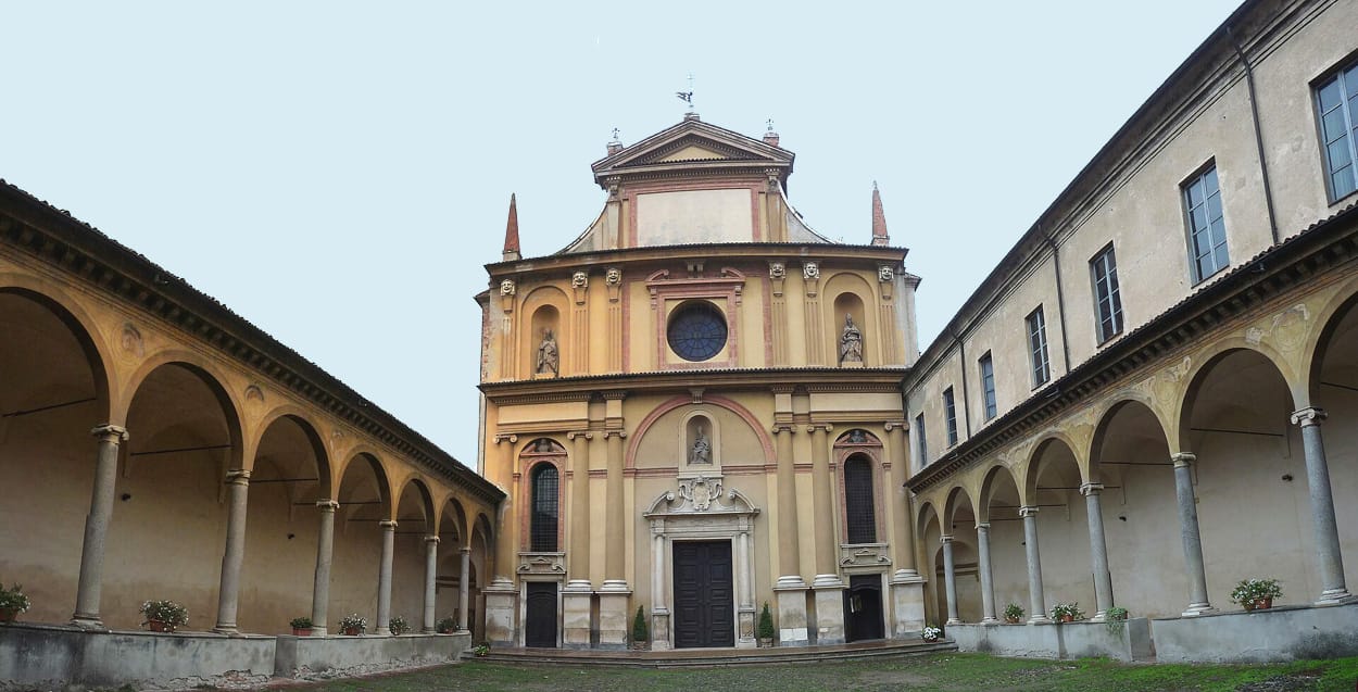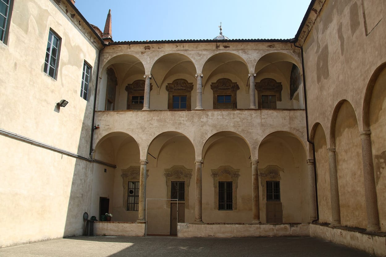 Il portale permette l'accesso al chiostro triportico realizzato nel 1576. Il portico è rivolto verso la porzione interna del sagrato per mezzo di archi a tutto sesto che appoggiano su esili colonne marmoree dotate di capitelli di ordine ionico. Ognuna delle colonne si basa su di un basso muretto che chiude continuativamente la porzione inferiore del portico, le cui campate sono dotate di volta a crociera.