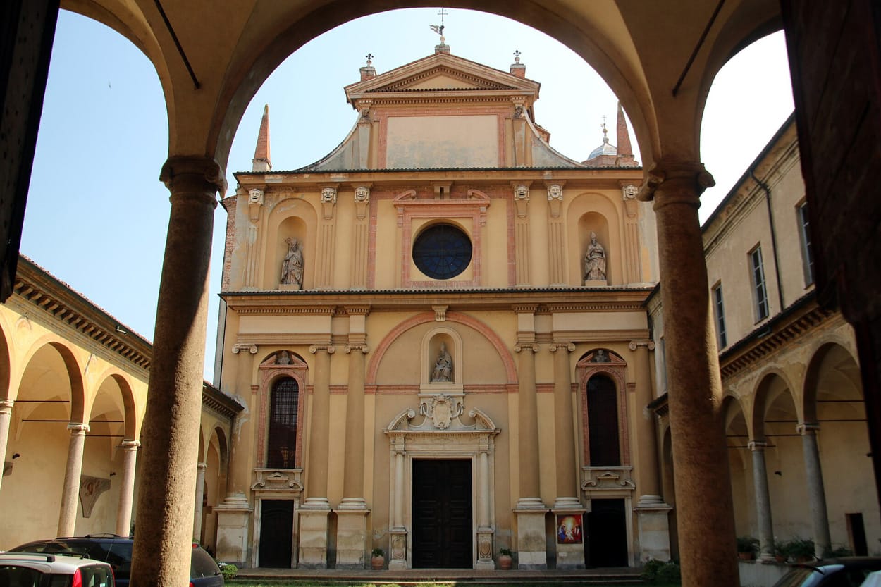 La facciata della chiesa, compiuta nel 1591, si presenta a vento. Tramite dei cornicioni orizzontali in aggetto si divide in due ordini sovrapposti, mentre sulla sommità si trova una vela di forma rettangolare, al cui interno è presente uno specchio incorniciato da una decorazione in cotto. La vela si esaurisce in un frontone e presenta ai vertici delle erme rappresentanti figure umane. La vela si ricollega all'ordine immediatamente inferiore per mezzo di puntoni curvi ai cui lati sono presenti guglie a forma di piramide.